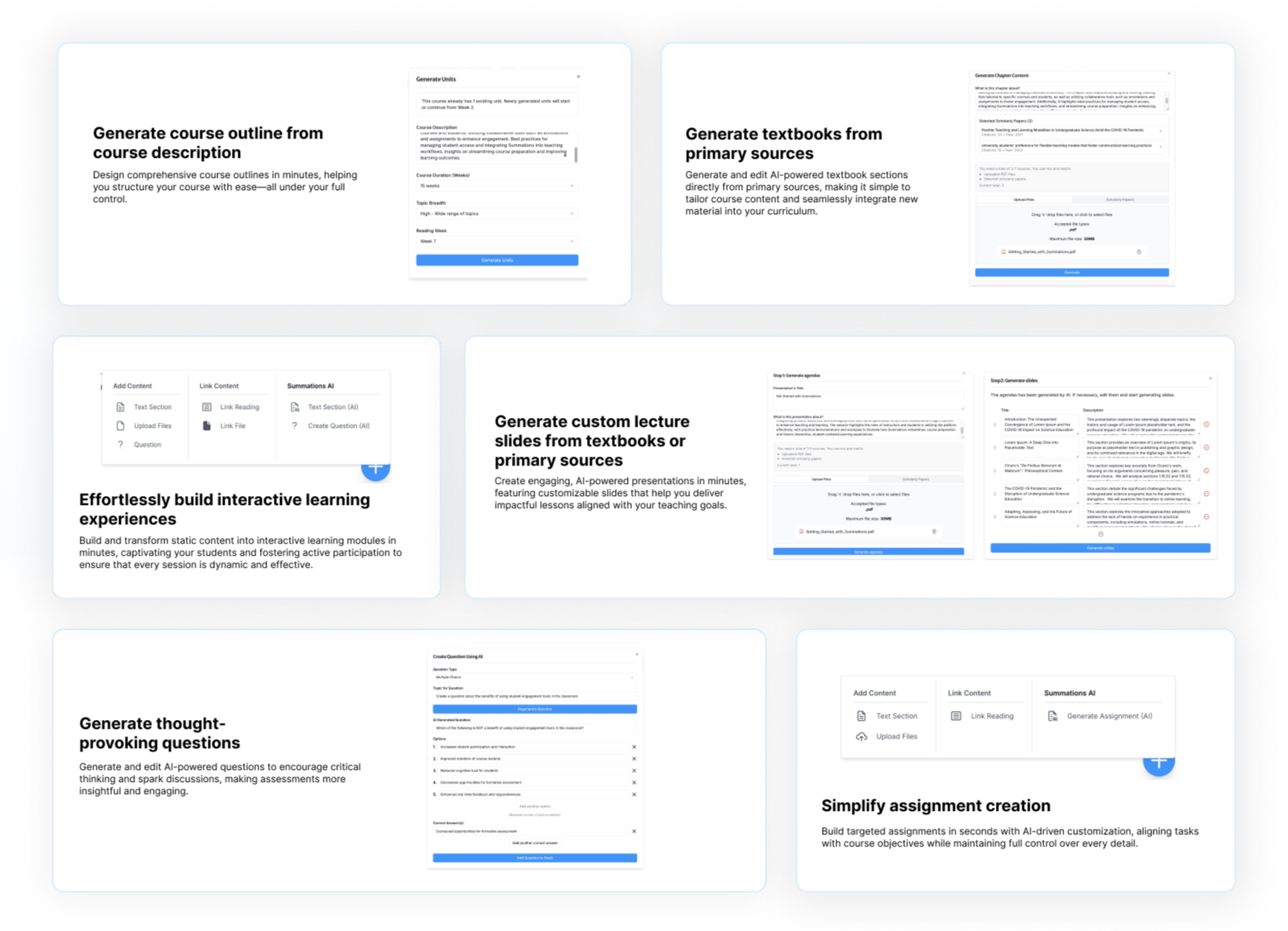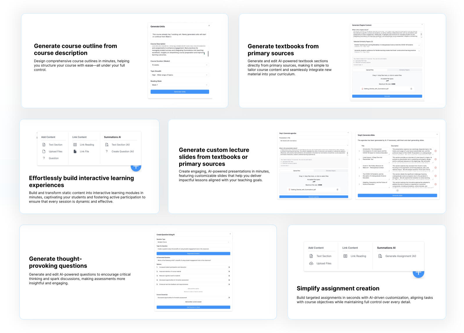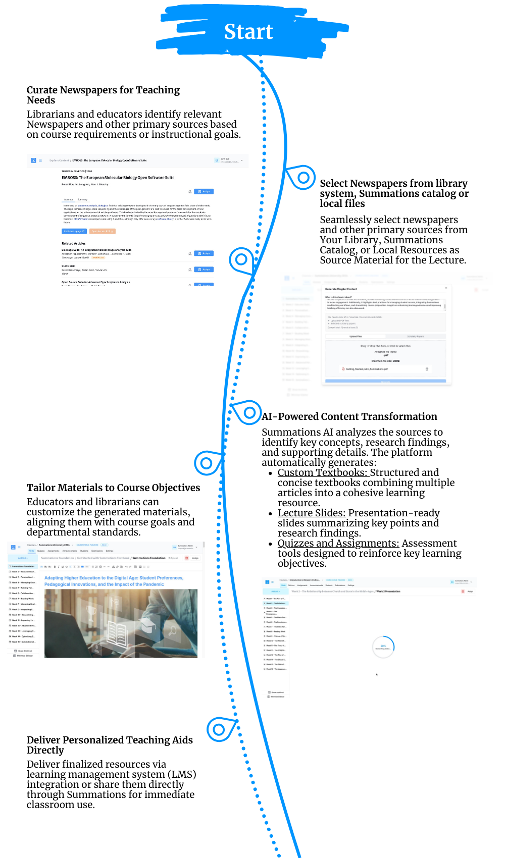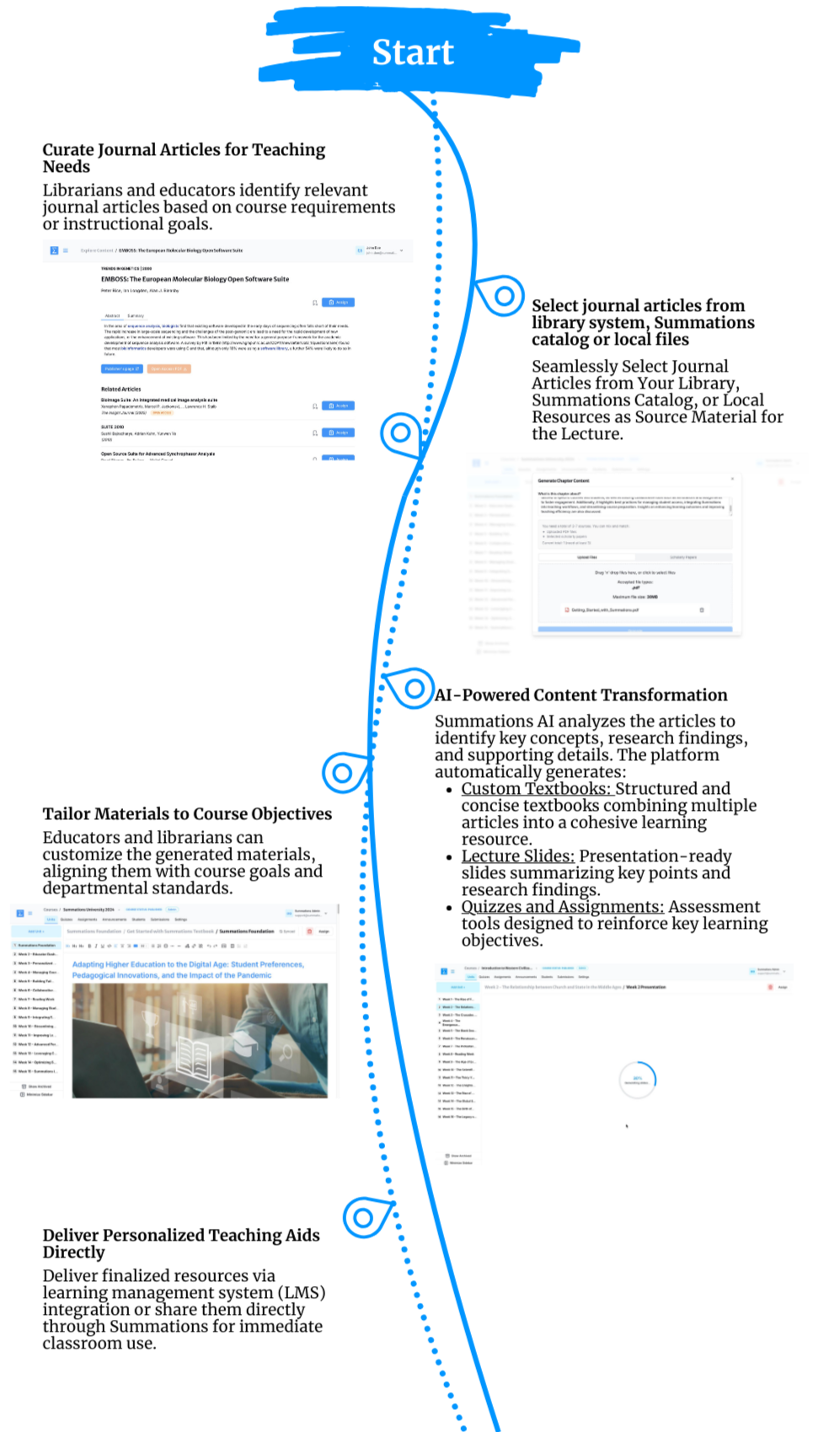 At Summations, we partner with libraries and educators to bring scholarly articles, textbooks, and primary research into classrooms with ease. Our AI-powered solutions enable your library to transform subscribed resources and collections into personalized, instruction-ready materials—such as lecture slides, quizzes, assignments, and more—ensuring your content supports both teaching and learning.By integrating Summations into your library, you can:
